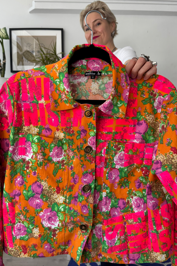The jacket is made of mid heavy cotton and elastine blend fabric. The flowers were an original fabric print and I added my signature statement “ feminism is unisex” in neon pink print using a screen printing method. The statements were handprinted on the fabric one by one.