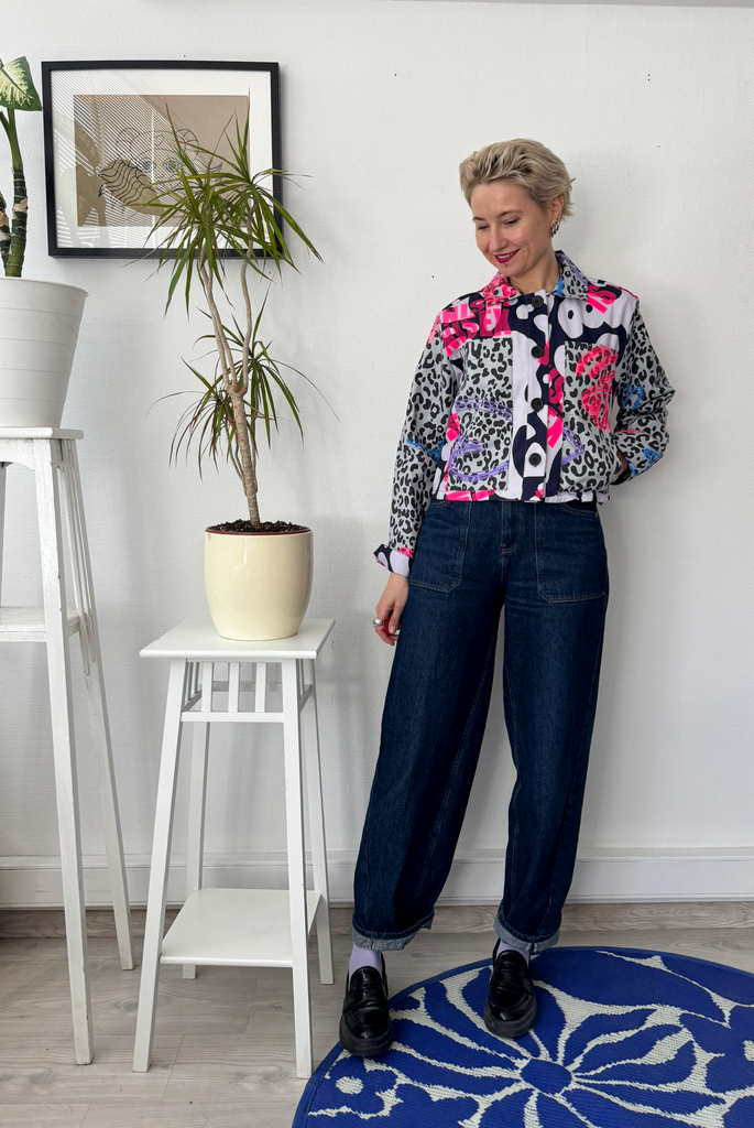 The jacket is made of mid heavy cotton and elastine blend fabric. The leopard pattern was on an original fabric print and I added my original drawings in neon pink, blue and purple print using a screen printing method. The purple patterned fabric has handprinted neon pink statements Feminism is unisex on. The statements were handprinted on the fabric one by one.