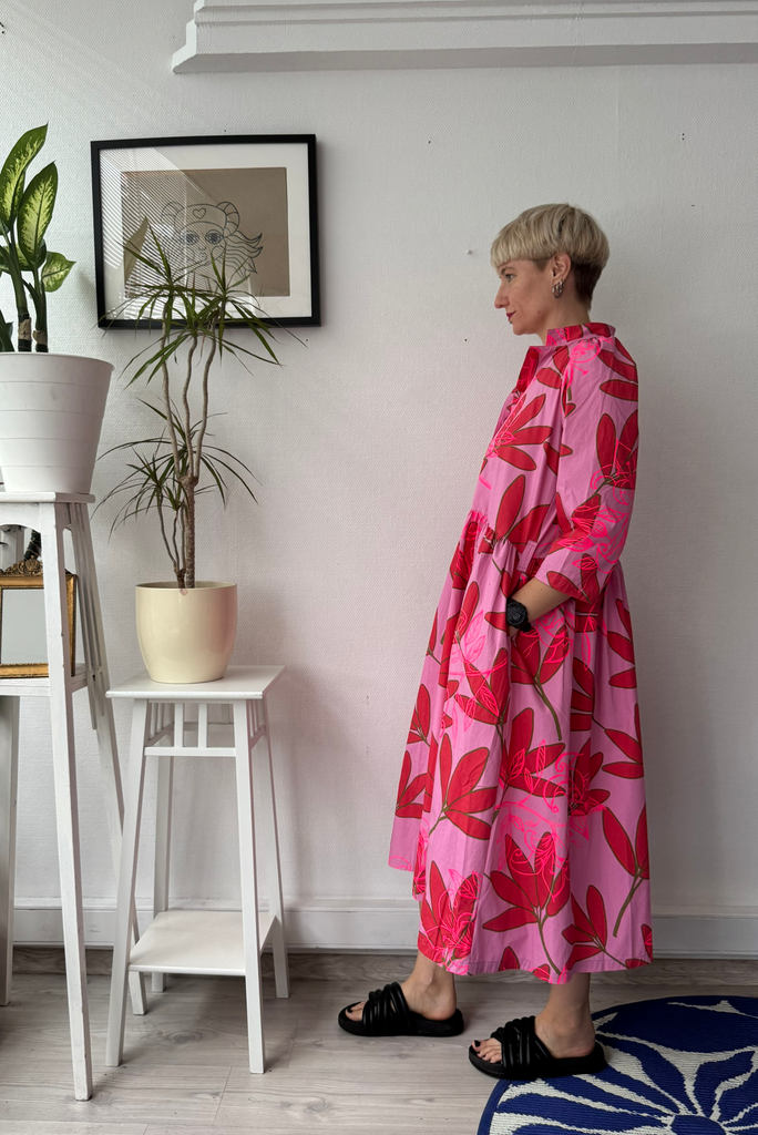 This is super feminine and fun and super comfortable. You'll feel like a fun and cool woman. The design feels great as it is midi lenght and feels loose and comfortable, but does not look oversized. It has hidden side pockets. Wear it with or without belt (the belt doesn't come with the dress) and change the looks of the dress with the styling.